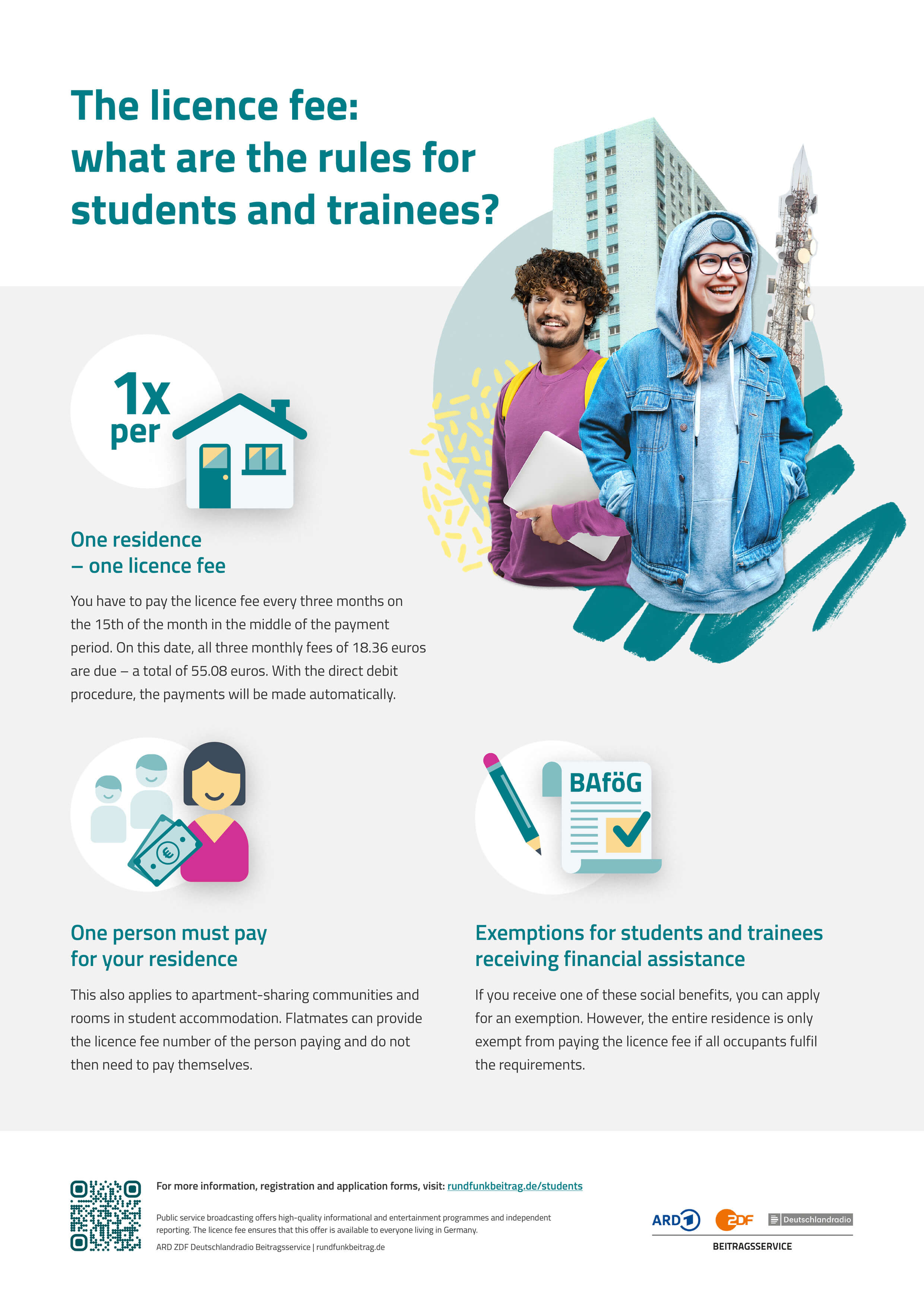What do students and trainees need to know about the license fee? The ARD, ZDF and Deutschlandradio contribution service provides an overview of the most important facts.