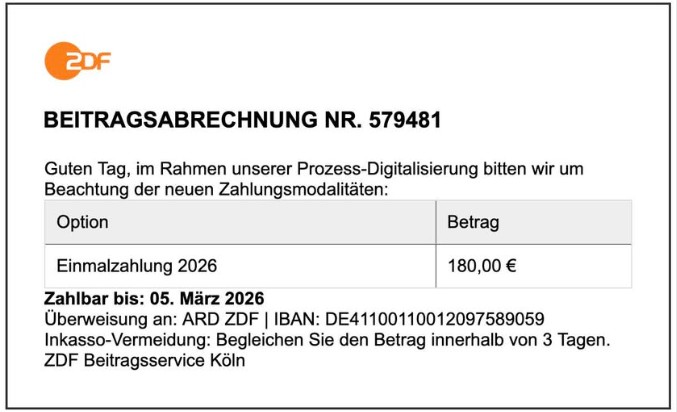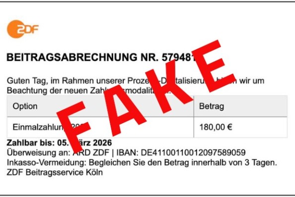 Im Namen des ZDF wird aktuell per E-Mail zu Zahlungen an den Beitragsservice aufgefordert. Es handelt sich bei diesen E-Mails um Fälschungen. Sie stammen weder vom ZDF noch vom Beitragsservice. Haben Sie eine gefälschte Rechnung erhalten, sollten Sie auf keinen Fall Geld überweisen.
