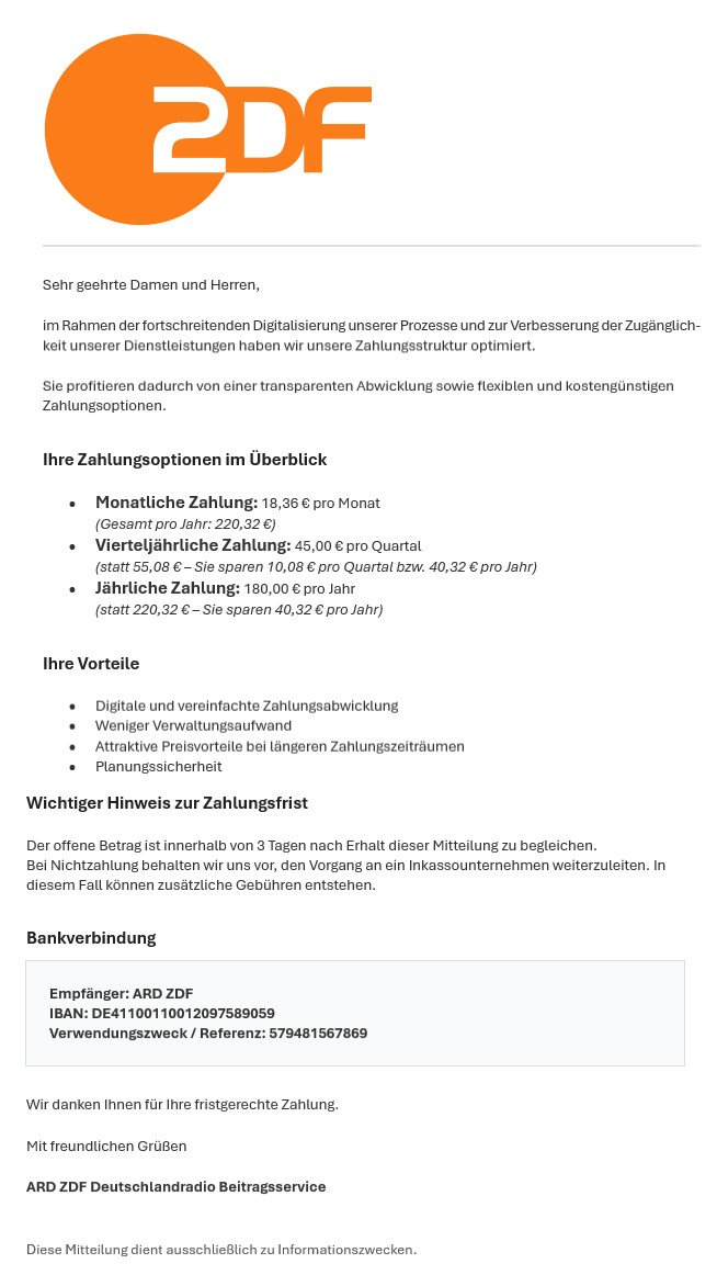 Die Betrüger fordern dazu auf, Zahlungen zum Rundfunkbeitrag zu leisten und begründen dies mit der “Digitalisierung unserer Prozesse”. Teilweise wird mit Rabatten geworben (z. B. “Sie sparen pro Jahr 40,32 Euro”).